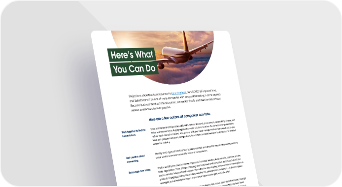 Here’s What You Can Do Projections show that business travel is bouncing back from COVID-19-imposed lows, and Salesforce will be one of many companies with people still traveling in some capacity. Because business travel will still take place, companies should work hard to reduce travel- related emissions wherever possible. Hereare a few actions all companies can take: Grow internal partnerships across different functions like travel, procurement, sustainability, finance, and Work together to find the sales, as these are key to forging organization-wide solutions to deliver the behavior change needed to best solutions reduce travel-related emissions. Also, partner with your travel management company, reach out to your travel and procurement peers, ask questions, benchmark, and collaborate on best practices to establish across the industry. Identify which types of travel are truly business-essential and where the opportunities exist to switch to Getcreative about virtual solutions or more sustainable modes of transportation. connecting Provide visibility into travel emissions impacts for individual travelers, business units, countries, and the Encouragenew norms wider organization. Then, strongly encourage and build lower-emissions travel options such as rail and electric vehicles into your travel program. Normalize the idea of opting for low emissions travel options as a default. Changing social norms and behaviors like this takes time and investment – it doesn’t happen overnight, but ultimately the impact of this sort of systemic change is worth the effort. Seek out external initiatives where you can get involved to help reduce travel-related emissions. Leverage Speak up externally collaboration and advocacy to drive systemic change and lower-carbon transportation options. Some ways we’ve gotten involved include the Sustainable Aviation Buyers’ Alliance, Clean Skies for Tomorrow, and the Global Business Travel Association's Sustainability and Responsibility Committee. It’s Time to Act The world is in a climate crisis. To avoid its worst impacts will require every facet of society to act boldly to create a sustainable future. Reducing business travel emissions is a critical component of realizing a sustainable future for all. Every company has the ability to transform how they travel with the goal of drastically decarbonizing their travel footprint. Learn more about Salesforce’s Climate Action Plan 7 | Salesforce.com/sustainability