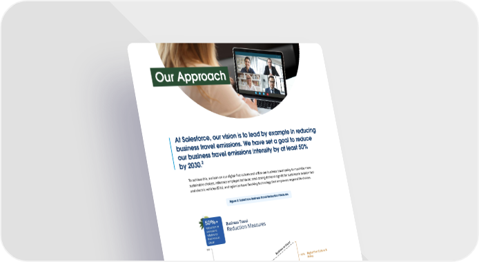 Our Approach At Salesforce, our vision is to lead by example in reducing business travel emissions. We have set a goal to reduce our business travel emissions intensity by at least 50% by 2030.2 To achieve this, we lean on our digital-first culture and utilize our business travel policy to maximize more sustainable choices, influence employee behavior, send strong demand signals for sustainable aviation fuel and electric vehicles (EVs), and optimize travel booking technology that empowers responsible choices. Figure 2: Salesforce Business Travel Reduction Measures 2 Our business travel goal is to reduce emissions intensity, per dollar of revenue, by 50% by 2030 (in comparison with 2019 levels). 3 | Salesforce.com/sustainability
