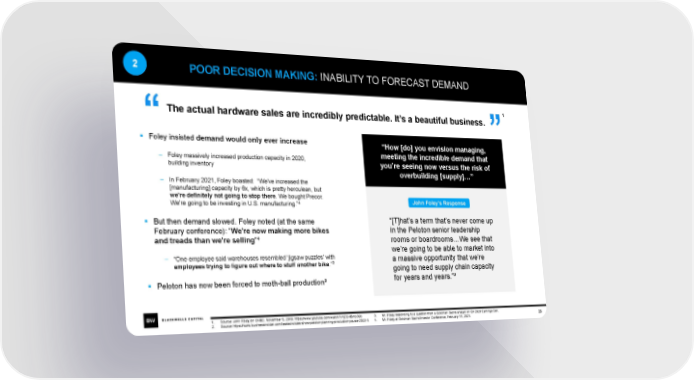 2 POOR DECISION MAKING: INABILITY TO FORECAST DEMAND The actual hardware sales are incredibly predictable. It’s a beautiful business. ¹ ▪ Foley insisted demand would only ever increase “How [do] you envision managing, – Foley massively increased production capacity in 2020, meeting the incredible demand that building inventory you’re seeing now versus the risk of overbuilding [supply]…” – In February 2021, Foley boasted: “We've increased the [manufacturing] capacity by 6x, which is pretty herculean, but we're definitely not going to stop there. We bought Precor. John Foley’s Response We're going to be investing in U.S. manufacturing.”4 ▪ But then demand slowed. Foley noted (at the same “[T]hat’s a term that’s never come up February conference): “We're now making more bikes in the Peloton senior leadership and treads than we're selling”4 rooms or boardrooms…We see that we’re going to be able to market into – “One employee said warehouses resembled ‘jigsaw puzzles’ with a massive opportunity that we’re 2 employees trying to figure out where to stuff another bike.” going to need supply chain capacity ▪ Peloton has now been forced to moth-ball production² for years and years.”³ 1. Source: John Foley on CNBC. November 5, 2019. https://www.youtube.com/watch?v=jZO-IBmp39o 3. Mr. Foley responding to a question from a Goldman Sachs analyst on Q4 2020 Earnings Call. 28 2. Source: https://www.businessinsider.com/leaked-slides-show-peloton-planning-production-pause-2022-1. 4. Mr. Foley at Goldman Sachs Investor Conference, February 11, 2021.