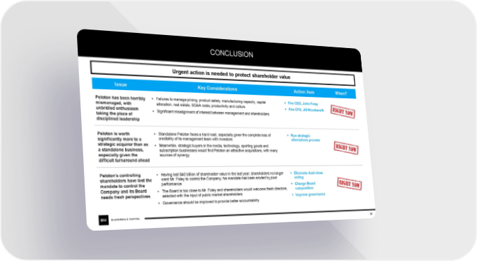 CONCLUSION Urgent action is needed to protect shareholder value Issue Key Considerations Action Item When? Peloton has been horribly • Failures to manage pricing, product safety, manufacturing capacity, capital ▪ Fire CEO, John Foley mismanaged, with allocation, real estate, SG&A costs, productivity and culture ▪ Fire CFO, Jill Woodworth unbridled enthusiasm • Significant misalignment of interest between management and shareholders taking the place of disciplined leadership Peloton is worth • Standalone Peloton faces a hard road, especially given the complete loss of ▪ Run strategic significantly more to a credibility of its management team with investors alternatives process strategic acquiror than as • Meanwhile, strategic buyers in the media, technology, sporting goods and a standalone business, subscription businesses would find Peloton an attractive acquisitions, with many especially given the sources of synergy difficult turnaround ahead Peloton’s controlling • Having lost $40 billion of shareholder value in the last year, shareholders no longer ▪ Eliminate dual-class shareholders have lost the want Mr. Foley to control the Company; his mandate has been eroded by poor voting mandate to control the performance ▪ Change Board Company and its Board • The Board is too close to Mr. Foley and shareholders would welcome fresh directors, composition needs fresh perspectives selected with the input of public market shareholders ▪ Improve governance • Governance should be improved to provide better accountability 63