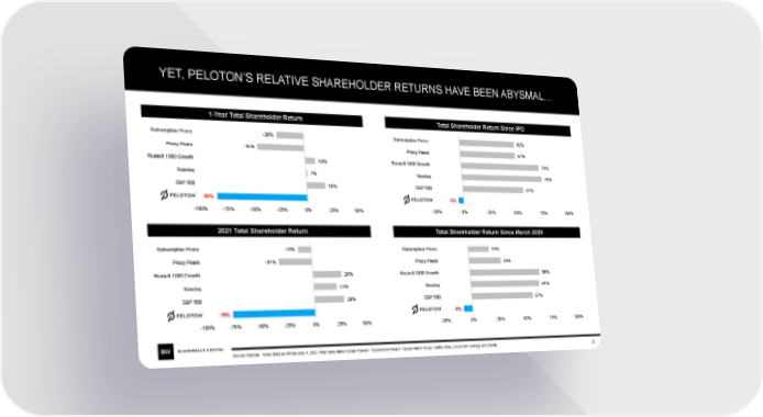 YET, PELOTON’S RELATIVE SHAREHOLDER RETURNS HAVE BEEN ABYSMAL… 1-Year Total Shareholder Return Total Shareholder Return Since IPO Subscription Peers -26% Subscription Peers 52% Proxy Peers -45% Proxy Peers 52% Russell 1000 Growth 10% Russell 1000 Growth 74% Nasdaq 1% Nasdaq 76% S&P 500 18% S&P 500 57% -84% -5% -100% -75% -50% -25% 0% 25% 50% -25% 0% 25% 50% 75% 100% 2021 Total Shareholder Return Total Shareholder Return Since March 2020 Subscription Peers -13% Subscription Peers 19% Proxy Peers -31% Proxy Peers 29% Russell 1000 Growth 28% Russell 1000 Growth 66% Nasdaq 22% Nasdaq 64% S&P 500 29% S&P 500 57% -76% -8% -100% -75% -50% -25% 0% 25% 50% -25% 0% 25% 50% 75% 100% Source: FactSet. Note: Data as of February 4, 2022. Peer data refers to peer median. “Subscription Peers” include Match Group, Netflix, Roku, Sirius XM Holdings and Spotify. 21