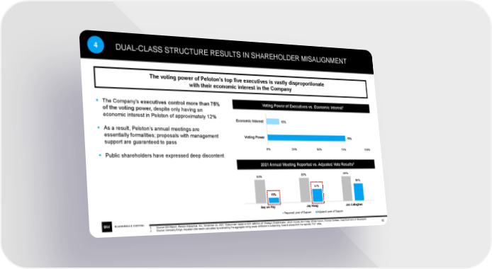4 DUAL-CLASS STRUCTURE RESULTS IN SHAREHOLDER MISALIGNMENT The voting power of Peloton’s top five executives is vastly disproportionate with their economic interest in the Company ▪ The Company’s executives control more than 75% Voting Power of Executives vs. Economic Interest1 of the voting power, despite only having an economic interest in Peloton of approximately 12% Economic Interest 12% ▪ As a result, Peloton’s annual meetings are essentially formalities; proposals with management Voting Power 78% support are guaranteed to pass 0% 25% 50% 75% 100% ▪ Public shareholders have expressed deep discontent 2021 Annual Meeting Reported vs. Adjusted Vote Results2 83% 89% 93% 65% 47% 19% Say on Pay Jay Hoag Jon Callaghan Reported Level of Support Adjusted Level of Support 1. Source: ISS Report, Peloton Interactive, Inc., November 23, 2021. “Executives” based on ISS’ definition of “Strategic Shareholders,” which include John Foley, William Lynch, Thomas Cortese, Hisao Kushi and Jill Woodworth. 52 2. Source: Company filings. Adjusted vote results calculated by subtracting the aggregate voting power of Peloton’s outstanding Class B shares from the reported “For” votes.