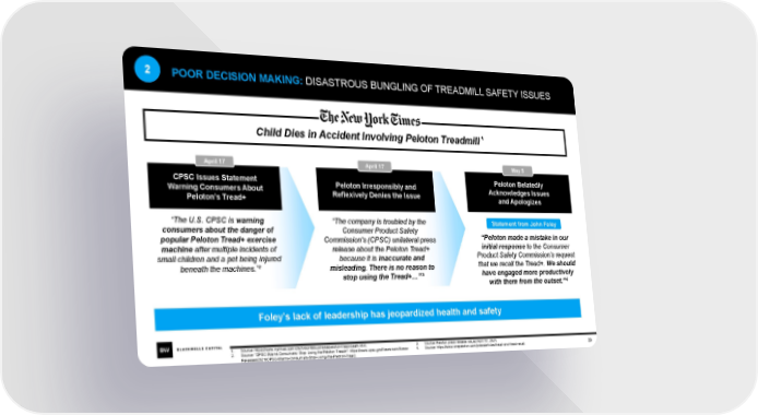 2 POOR DECISION MAKING: DISASTROUS BUNGLING OF TREADMILL SAFETY ISSUES Child Dies in Accident Involving Peloton Treadmill¹ April 17 April 17 May 5 CPSC Issues Statement Peloton Irresponsibly and Peloton Belatedly Warning Consumers About Reflexively Denies the Issue Acknowledges Issues Peloton’s Tread+ and Apologizes “The U.S. CPSC is warning “The company is troubled by the Statement from John Foley consumers about the danger of Consumer Product Safety “Peloton made a mistake in our popular Peloton Tread+ exercise Commission's (CPSC) unilateral press initial response to the Consumer machineafter multiple incidents of release about the Peloton Tread+ Product Safety Commission’s request small children and a pet being injured because it is inaccurate and that we recall the Tread+. We should beneath the machines.”² misleading. There is no reason to have engaged more productively stop using the Tread+…”³ with them from the outset.”4 Foley’s lack of leadership has jeopardized health and safety 1. Source: https://www.nytimes.com/2021/03/18/business/peloton-tread-death.html. 3. Source: Peloton press release issued April 17, 2021. 29 2. Source: “CPSC Warns Consumers: Stop Using the Peloton Tread+”: https://www.cpsc.gov/Newsroom/News- 4. Source: https://www.onepeloton.com/press/articles/tread-and-tread-recall. Releases/2021/CPSC-Warns-Consumers-Stop-Using-the-Peloton-Tread.