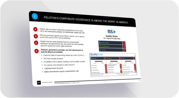 1 PELOTON’S CORPORATE GOVERANCE IS AMONG THE WORST IN AMERICA X Peloton has an overall Governance QualityScore of 9/10 and a 10/10, the worst score possible, for Shareholder Rights from ISS ISS recommended against every Peloton director up for election Quality Score X at the 2020 and the 2021 Annual Meetings 10 = Highest Possible Risk X Peloton has the worst possible score for environmental disclosure and governance risk, and nearly the worst possible score for social and human rights disclosure X Peloton’s governance provides very few mechanisms to hold the Board accountable ▪ A second class of supervoting shares (at a ratio of 20-to-1) ▪ No Proxy Access provision ▪ No ability to call a special meeting or act by written consent ▪ No majority vote standard to elect directors ▪ Classified Board structure ▪ Bylaw amendments require a supermajority vote Source: ISS Report, Peloton Interactive, Inc., November 23, 2021 45