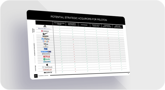 POTENTIAL STRATEGIC ACQUIRORS FOR PELOTON PTON Subscriber Base Existing Health & Cost Synergies Can Lower Cost of Complementary Ability to Sell Valuable Fitness Business Customer Acq. Hardware / Wearables Additional Products ✓ ✓ ✓ ✓ ✓ ✓ ✓ ✓ ✓ ✓ ✓ ✓ g s n d rtio ✓ ✓ ✓ ✓ ✓ ✓ o Go Sp ✓ ✓ ✓ ✓ ✓ ✓ ✓ ✓ ✓ ✓ 8 ✓ ✓ 8 ✓ ✓ ✓ ✓ ✓ ✓ ✓ ✓ ✓ ✓ on ✓ 8 ✓ ✓ 8 ✓ i pt ri c ✓ 8 ✓ ✓ 8 ✓ Subs ✓ 8 ✓ ✓ 8 ✓ d an ✓ 8 ✓ ✓ 8 ✓ nt te ✓ 8 ✓ ✓ 8 ✓ on C ✓ 8 ✓ ✓ 8 ✓ ✓ 8 ✓ ✓ 8 ✓ ✓ 8 ✓ ✓ 8 ✓ y ✓ ✓ ✓ ✓ ✓ ✓ g o l ✓ ✓ ✓ ✓ ✓ ✓ o n h c ✓ 8 ✓ ✓ 8 ✓ Te ✓ 8 ✓ ✓ ✓ ✓ 59