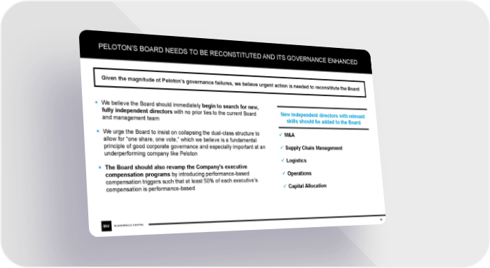 PELOTON’S BOARD NEEDS TO BE RECONSTITUTED AND ITS GOVERNANCE ENHANCED Given the magnitude of Peloton’s governance failures, we believe urgent action is needed to reconstitute the Board ▪ We believe the Board should immediately begin to search for new, fully independent directors with no prior ties to the current Board New independent directors with relevant and management team skills should be added to the Board ▪ We urge the Board to insist on collapsing the dual-class structure to ✓M&A allow for “one share, one vote,” which we believe is a fundamental principle of good corporate governance and especially important at an ✓Supply Chain Management underperforming company like Peloton ✓Logistics ▪ The Board should also revamp the Company’s executive compensation programs by introducing performance-based ✓Operations compensation triggers such that at least 50% of each executive’s compensation is performance-based ✓Capital Allocation 54
