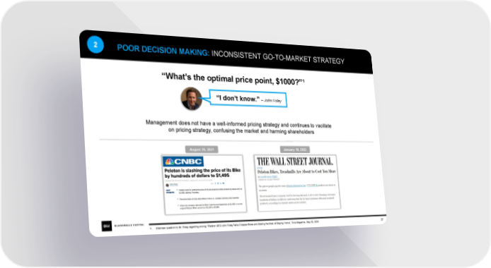 2 POOR DECISION MAKING: INCONSISTENT GO-TO-MARKET STRATEGY “What’s the optimal price point, $1000?”¹ “I don’t know.” –John Foley Management does not have a well-informed pricing strategy and continues to vacillate on pricing strategy, confusing the market and harming shareholders August 26, 2021 January 18, 2022 1. Interview question to Mr. Foley regarding pricing: “Peloton CEO John Foley Talks Cheaper Bikes and Making the Most of Staying Home”, Time Magazine, May 26, 2020. 27