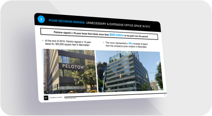 2 POOR DECISION MAKING: UNNECESSARY & EXPENSIVE OFFICE SPACE IN NYC Peloton signed a 15-year lease that totals more than $450 million to be paid over the period ▪ At the end of 2018, Peloton signed a 15-year ▪ The move represented a +6x increase of space lease for 300,000 square feet in Manhattan from the company’s prior location in Manhattan Source: Company filings. 31