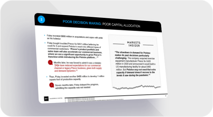 2 POOR DECISION MAKING: POOR CAPITAL ALLOCATION ▪ Foley invested $800 million in acquisitions and capex with pride as his lodestar ▪ Foley bought troubled Precor for $431 million believing he could fix it and expand Peloton’s reach into different types of commercial customers: “Precor’s product portfolio and “The slowdown in demand for Peloton sales team will also accelerate our commercial business, makes its past decisions particularly where we see a significant opportunity to grow Precor’s franchise while introducing the Peloton platform…”1 challenging. The company acquired exercise – Months later, he was forced to admit it was a mistake: equipment manufacturer Precor for $420 “[W]e have reduced expectations for our commercial million in 2020 and announced it would build a channel or legacy Precor business, given both supply US manufacturing facility for about $400 2 million. But Peloton may not need that extra and demand dynamics.” capacity if demand doesn't recover to the ▪ Then, Foley invested another $400 million to develop 1 million levels it saw during the pandemic.”3 square feet of production capacity – Seven months later, Foley delayed the progress, admitting the capacity was not needed 1. Source: Peloton Interactive Q2 2021 Earnings Call transcript. 30 2. Source: Peloton Interactive Q1 2022 Earnings Call transcript. 3. Source: https://markets.businessinsider.com/news/stocks/peloton-stock-falls-below-ipo-price-production-halt-demand-drop-2022-1.