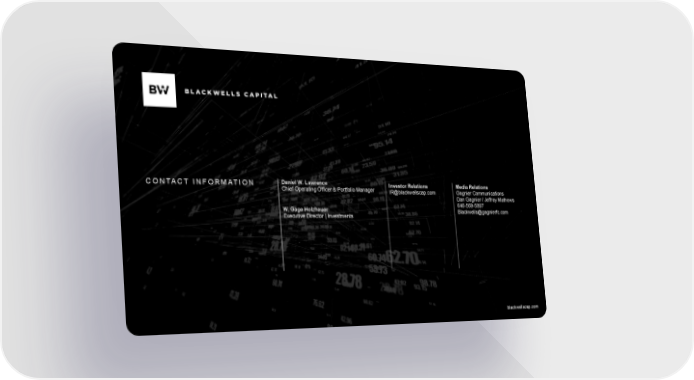 CONTACT INFORMATION Daniel W. Lawrence Investor Relations Media Relations Chief Operating Officer & Portfolio Manager [email protected] Gagnier Communications Dan Gagnier / Jeffrey Mathews W. Gage Holzhauer 646-569-5897 Executive Director | Investments [email protected] blackwellscap.com