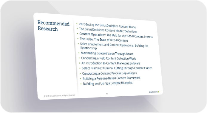 Recommended • Introducing the SiriusDecisions Content Model Research • The SiriusDecisions Content Model: Definitions • Content Operations: The Hub for the B-to-B Content Process • The Pulse: The State of B-to-B Content • Sales Enablement and Content Operations: Building the Relationship • Maximizing Content Value Through Reuse • Conducting a Field Content Collection Week • An Introduction to Content Marketing Software • Select Practice: Illumina: Cutting Through Content Clutter • Conducting a Content Process Gap Analysis • Building a Persona-Based Content Framework • Building and Using a Content Blueprint © 2015 SiriusDecisions. All Rights Reserved 36