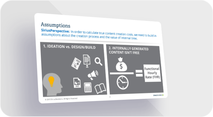 Assumptions In order to calculate true content creation costs, we need to build in SiriusPerspective: assumptions about the creation process and the value of internal time. 1. IDEATION vs. DESIGN/BUILD 2. INTERNALLY GENERATED CONTENT ISN’T FREE Functional Hourly Rate (FHR) © 2015 SiriusDecisions. All Rights Reserved 6