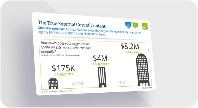 The True External Cost of Content As organizations grow, they rely much more heavily on external SiriusPerspective: agency partners to support content creation needs. How much does your organization 3.5 $8.2M spend on external content creation 10.4 agencies annually? SiriusDecisions 2015 Cost of Content survey $4M $175K 8.3 agencies 3.5 agencies <$100M< <$1B< © 2015 SiriusDecisions. All Rights Reserved 10