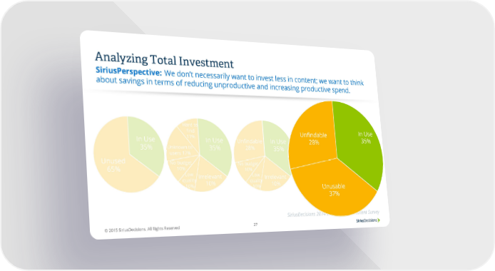 Analyzing Total Investment We don’t necessarily want to invest less in content; we want to think SiriusPerspective: about savings in terms of reducing unproductive and increasing productive spend. Hard to find Unfindable In Use In Use 11% In Use Unfindable In Use 28% 35% 35% Unknown to 35% 28% 35% users 17% Unused No budget No budget 65% 10% 10% Low Irrelevant Low Irrelevant quality 10% quality 10% 10% 10% Unusable 37% Analyzing Total Investment SiriusDecisions 2014 State of B-to-B Content Survey © 2015 SiriusDecisions. All Rights Reserved 27