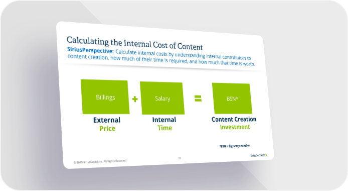 Calculating the Internal Cost of Content Calculate internal costs by understanding internal contributors to SiriusPerspective: content creation, how much of their time is required, and how much that time is worth. Billings Salary % BSN* External Internal Content Creation Price Time Investment *BSN = big scary number © 2015 SiriusDecisions. All Rights Reserved 11