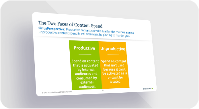 The Two Faces of Content Spend Productive content spend is fuel for the revenue engine; SiriusPerspective: unproductive content spend is evil and might be plotting to murder you. Productive Unproductive __________ __________ Spend on content Spend on content that is activated that isn’t used by internal because it can’t audiences and be activated as is consumed by or can’t be external located. audiences. © 2015 SiriusDecisions. All Rights Reserved 22