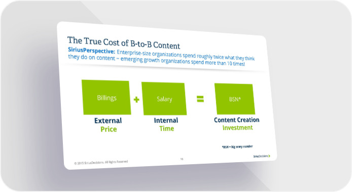 The True Cost of B-to-B Content SiriusPerspective: Enterprise-size organizations spend roughly twice what they think they do on content − emerging growth organizations spend more than 10 times! Billings Salary % BSN* External Internal Content Creation Price Time Investment *BSN = big scary number © 2015 SiriusDecisions. All Rights Reserved 16