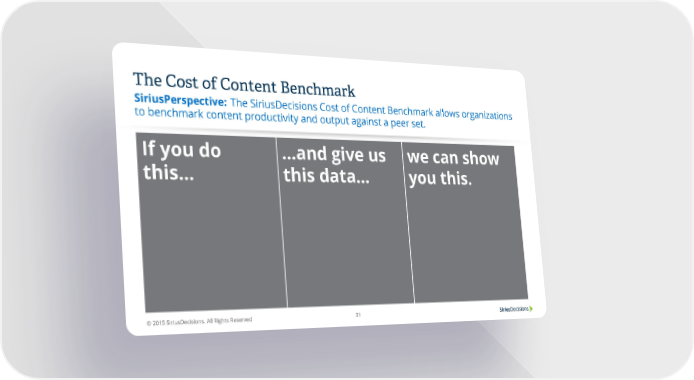 The Cost of Content Benchmark The SiriusDecisions Cost of Content Benchmark allows organizations SiriusPerspective: to benchmark content productivity and output against a peer set. If you do …and give us we can show this… this data… you this. © 2015 SiriusDecisions. All Rights Reserved 31