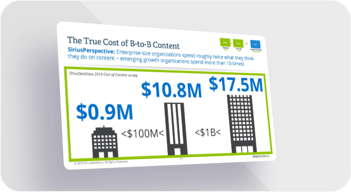 The True Cost of B-to-B Content Enterprise-size organizations spend roughly twice what they think SiriusPerspective: they do on content − emerging growth organizations spend more than 10 times! SiriusDecisions 2015 Cost of Content survey $8.2M $4M $17.5M $10.8M Content $175K Creation $0.9M <$100M< <$1B< Investment © 2015 SiriusDecisions. All Rights Reserved 17