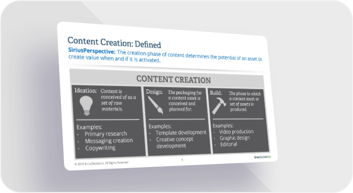 Content Creation: Defined The creation phase of content determines the potential of an asset to SiriusPerspective: create value when and if it is activated. CONTENT CREATION Ideation: Content is Design: The packaging for Build: The phase in which conceived of as a a content asset is a content asset or set of raw conceived and set of assets is materials. planned for. produced. Examples: Examples: Examples: - Primary research - Template development - Video production - Messaging creation - Creative concept - Graphic design - Copywriting development - Editorial © 2015 SiriusDecisions. All Rights Reserved 5