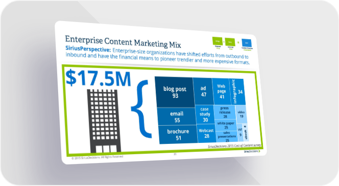 Enterprise Content Marketing Mix Enterprise-size organizations have shifted efforts from outbound to SiriusPerspective: inbound and have the financial means to pioneer trendier and more expensive formats. c i $17.5M ad Web h blog post ap page r 34 47 g 93 41 o f n i case press email study release video 55 30 28 19 { white paper Webcast 25 VAT 8 brochure sales 51 28 presentations 9 ebook 25 SiriusDecisions 2015 Cost of Content survey © 2015 SiriusDecisions. All Rights Reserved 20