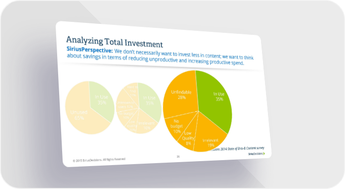Analyzing Total Investment We don’t necessarily want to invest less in content; we want to think SiriusPerspective: about savings in terms of reducing unproductive and increasing productive spend. Hard to find Unfindable In Use In Use 11% In Use 28% Unfindable In Use 35% 35% Unknown to 35% 28% 35% users 17% Unused No budget No budget 65% 10% 10% Low No quality Irrelevant Low Irrelevant quality 10% 10% budget 10% 10% 10% Low Quality Irrelevant 8% 19% Analyzing Total Investment SiriusDecisions 2014 State of B-to-B Content survey © 2015 SiriusDecisions. All Rights Reserved 26