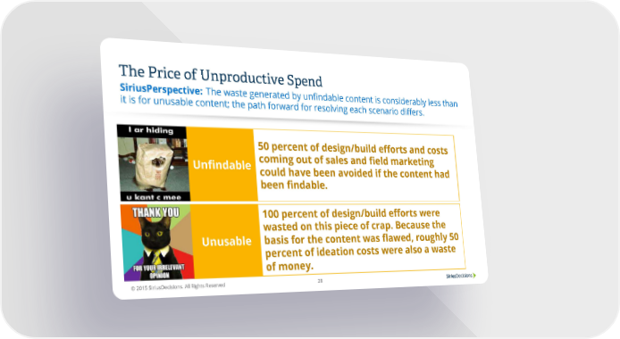 The Price of Unproductive Spend The waste generated by unfindable content is considerably less than SiriusPerspective: it is for unusable content; the path forward for resolving each scenario differs. 50 percent of design/build efforts and costs Unfindable coming out of sales and field marketing could have been avoided if the content had been findable. 100 percent of design/build efforts were wasted on this piece of crap. Because the Unusable basis for the content was flawed, roughly 50 percent of ideation costs were also a waste of money. © 2015 SiriusDecisions. All Rights Reserved 28