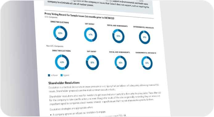 Corporate governance laws and best-practice codes are continuously evolving. We have constructed our guidelines to be both general enough and sufficiently flexible to adapt to such changes, and we periodically update them to reflect evolving norms. Note that not every resolution that falls into an ESG category represents an automatic vote in favor from Calvert. For example, the Social and Human Rights votes that Calvert did not support were attributable to micromanagement of the company or issues that did not meet the Calvert Principles, like a vote to repeal non-discrimination policies. Similarly, the votes that Calvert did not support in Environmental and Health were attributable to micromanagement of the company or issues that Calvert does not support, such as requiring the company to eliminate all use of nuclear power. Proxy Voting Record for Sample Issues (six months prior to 06/30/22) U.S. Companies DIRECTOR ELECTIONS SAY ON PAY SOCIAL AND HUMAN RIGHTS ENVIRONMENTAL AND HEALTH 63% 47% 83% 97% Non-U.S. Companies DIRECTOR ELECTIONS SAY ON PAY SOCIAL AND HUMAN RIGHTS ENVIRONMENTAL AND HEALTH 43% 81% 65% 67% In Favor Against Shareholder Resolutions Escalation is a tactical decision to increase pressure on a company that we believe isn’t adequately addressing material ESG issues. Shareholder proposals are the most common escalation tactic. Shareholder resolutions are a way for investors to get issues that are important to them onto the proxy ballot. These often call for the company to take specific action, and even though the results of the vote are generally nonbinding, they can serve as an important signal to companies about investor interest in specific issues that may not otherwise be a priority for them. Escalation strategies are appropriate when: „ A company ignores or refuses our invitation to engage. „ Takes no action, or no meaningful action, to address concerns about ESG risk. „ The analyst—possibly in consensus with investor partners—concludes that additional discussions are unlikely to move the discussion forward. After filing, we seek to negotiate an agreement to withdraw the proposal on terms that advance our objectives with the company and lead to a more collaborative dialogue. Calvert will proceed to a vote if the terms for withdrawal offered by the company are not sufficient to meet our expectations for progress. In 2022, Calvert filed three shareholder resolutions, two of which were withdrawn after the company committed to disclosing what we were asking for.