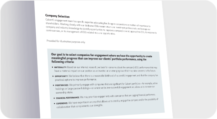 Company Selection Calvert’s engagement team has specific expertise advocating for change in corporations on matters of importance to shareholders. Working closely with our dedicated ESG research team and investment professionals, we leverage our company and industry knowledge to identify opportunities to improve a company’s overall approach to ESG, its response to controversies, or its management of ESG-related risks and opportunities. Provided for illustrative purposes only. Our goal is to select companies for engagement where we have the opportunity to create meaningful progress that can improve our clients’ portfolio performance, using the following criteria: „ MATERIALITY: Based on our internal research, we look for concerns about the company’s ESG performance that may have a material impact on our position as an investor, or an emerging issue that may raise concerns in the future. „ OPPORTUNITY: We believe that there is a reasonable likelihood of successful engagement, and that the company has practical options to improve performance. „ POSITION SIZE: We primarily engage with companies that are significant for Calvert portfolios—for example, active holdings or large passive holdings—or where we believe successful engagement will allow us to increase our ownership stake. „ FINANCIAL PERFORMANCE: We may prioritize engagements with companies that are lagging financial performers. „ EXPERIENCE: We have expertise in an area that allows us to credibly engage the company and/or the possibility of collaboration that complements our strengths. 5