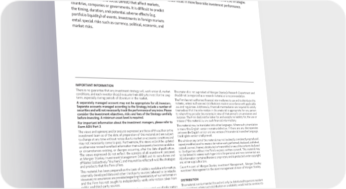 About Risk There is no assurance that a Portfolio will achieve its ESG Strategies that incorporate impact investing and/or investment objective. Portfolios are subject to market risk, Environmental, Social and Governance (ESG) factors could which is the possibility that the market values of securities result in relative investment performance deviating from owned by the Portfolio will decline and that the value of other strategies or broad market benchmarks, depending on Portfolio shares may therefore be less than what you paid whether such sectors or investments are in or out of favor in for them. Market values can change daily due to economic the market. As a result, there is no assurance ESG strategies and other events (e.g. natural disasters, health crises, could result in more favorable investment performance. terrorism, conflicts and social unrest) that affect markets, countries, companies or governments. It is difficult to predict the timing, duration, and potential adverse effects (e.g. portfolio liquidity) of events. Investments in foreign markets entail special risks such as currency, political, economic, and market risks. IMPORTANT INFORMATION There is no guarantee that any investment strategy will work under all market This material is not a product of Morgan Stanley’s Research Department and conditions, and each investor should evaluate their ability to invest for the long- should not be regarded as a research material or a recommendation. term, especially during periods of downturn in the market. The Firm has not authorised financial intermediaries to use and to distribute this A separately managed account may not be appropriate for all investors. material, unless such use and distribution is made in accordance with applicable Separate accounts managed according to the Strategy include a number of law and regulation. Additionally, financial intermediaries are required to satisfy securities and will not necessarily track the performance of any index. Please themselves that the information in this material is appropriate for any person consider the investment objectives, risks and fees of the Strategy carefully to whom they provide this material in view of that person’s circumstances and before investing. A minimum asset level is required. purpose. The Firm shall not be liable for, and accepts no liability for, the use or For important information about the investment managers, please refer to misuse of this material by any such financial intermediary. Form ADV Part 2. This material may be translated into other languages. Where such a translation The views and opinions and/or analysis expressed are those of the author or the is made this English version remains definitive. If there are any discrepancies investment team as of the date of preparation of this material and are subject between the English version and any version of this material in another language, to change at any time without notice due to market or economic conditions and the English version shall prevail. may not necessarily come to pass. Furthermore, the views will not be updated The whole or any part of this material may not be directly or indirectly reproduced, or otherwise revised to reflect information that subsequently becomes available copied, modified, used to create a derivative work, performed, displayed, published, or circumstances existing, or changes occurring, after the date of publication. posted, licensed, framed, distributed or transmitted or any of its contents disclosed The views expressed do not reflect the opinions of all investment personnel to third parties without the Firm’s express written consent. This material may at Morgan Stanley Investment Management (MSIM) and its subsidiaries and not be linked to unless such hyperlink is for personal and non-commercial use. affiliates (collectively “the Firm”), and may not be reflected in all the strategies All information contained herein is proprietary and is protected under copyright and products that the Firm offers. and other applicable law. This material has been prepared on the basis of publicly available information, Calvert is part of Morgan Stanley Investment Management. Morgan Stanley internally developed data and other third-party sources believed to be reliable. Investment Management is the asset management division of Morgan Stanley. However, no assurances are provided regarding the reliability of such information and the Firm has not sought to independently verify information taken from DISTRIBUTION public and third-party sources. This material is a general communication, which is not impartial and all information This material is only intended for and will only be distributed to persons resident provided has been prepared solely for informational and educational purposes and in jurisdictions where such distribution or availability would not be contrary to does not constitute an offer or a recommendation to buy or sell any particular local laws or regulations. security or to adopt any specific investment strategy. The information herein has MSIM, the asset management division of Morgan Stanley (NYSE: MS), and its not been based on a consideration of any individual investor circumstances and is affiliates have arrangements in place to market each other’s products and services. not investment advice, nor should it be construed in any way as tax, accounting, Each MSIM affiliate is regulated as appropriate in the jurisdiction it operates. legal or regulatory advice. To that end, investors should seek independent legal MSIM’s affiliates are: Eaton Vance Management (International) Limited, Eaton and financial advice, including advice as to tax consequences, before making any Vance Advisers International Ltd, Calvert Research and Management, Eaton investment decision. Vance Management, Parametric Portfolio Associates LLC, and Atlanta Capital Charts and graphs provided herein are for illustrative purposes only. Past Managem