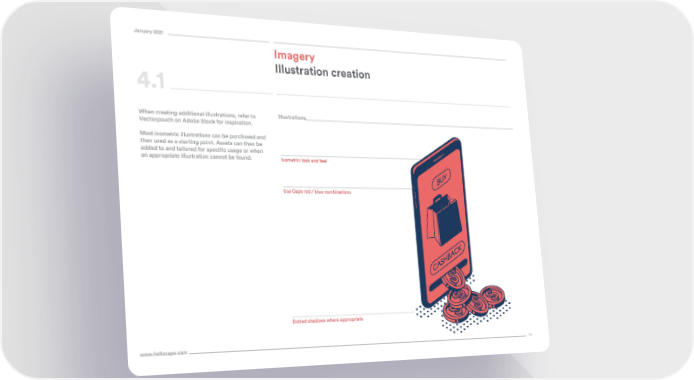 January 2021 Imagery 4.1 Illustration creation Illustrations When creating additional illustrations, refer to Vectorpouch on Adobe Stock for inspiration. Most isometric illustrations can be purchased and then used as a starting point. Assets can then be added to and tailored for speciļ¬c usage or when an appropriate illustration cannot be found. Isometric look and feel Use Cape red / blue combinations Dotted shadows where appropriate www.hellocape.com 14