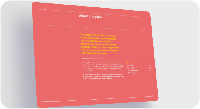 September 2016January 2021 About this guide The guide explains what our brand stands for, how it’s expressed, and how the creative elements fit together in all our communications. It should inspire and encourage more effective communications whenever they carry the Cape logo. A strong brand is one of the most valuable assets an organisation Contents owns – it can mean the difference between a client choosing us, 1.0 Logo 03 or one of our competitors. It is the visual and written expression 2.0 Colour 06 of everything we are, and everything we promise to deliver to our clients. 3.0 Typography 08 To make it truly impactful it needs to be applied consistently . 4.0 Imagery 12 Everyone has a part to play in doing this and bringing our brand to life – these elements are here to help you. wwwwww.hellocape.com.i-l-m.com 022