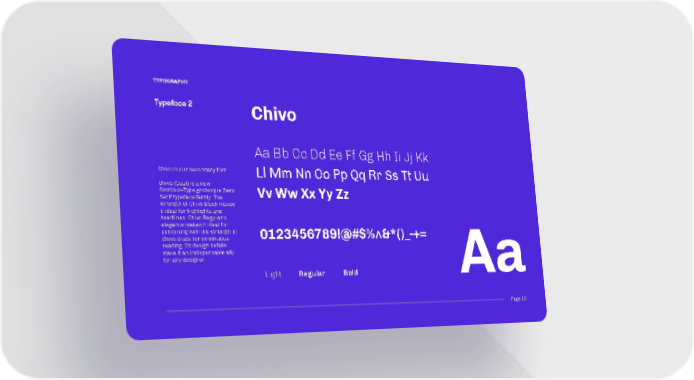 Page 18 TYPOGRAPHY Chivo is our secondary font. Chivo (Goat) is a new Omnibus-Type grotesque Sans Serif typeface family. The strength of Chivo Black makes it ideal for highlights and headlines. Chivo Regular's elegance makes it ideal for combining with the strength of Chivo Black for continuous reading. Its design details make it an indispensable ally for any designer. Typeface 2 Aa Chivo Aa Bb Cc Dd Ee Ff Gg Hh Ii Jj Kk Ll Mm Nn Oo Pp Qq Rr Ss Tt Uu Vv Ww Xx Yy Zz 0123456789!@#$%^&*()_-+= Light Regular Bold