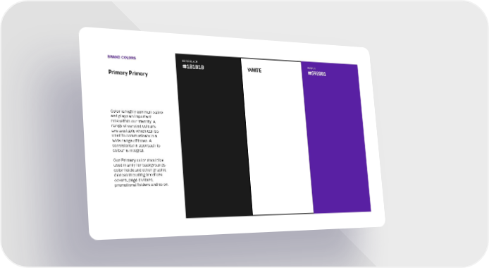 BRAND COLORS Color is highly communicative and plays an important role within our identity. A range of curated colours are available which can be used to communicate in a wide range of tones. A consistency in approach to colour is integral. Our Primary color should be used mainly for backgrounds, color fields and other graphic devices including brochure covers, page dividers, promotional folders and so on. Primary Primary EERIE BLACK #1B1B1B WHITE PURPLE #5920B1