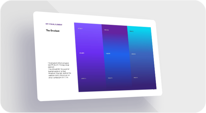 Page 11 KEY VISUAL ELEMENT The gradient where created specifically for the key visual element. They should NOT be used for backgrounds or on text. However, they can used on the webiste button & icons or on email campaigns for CTAs. The Gradient #8C58FF #6623AC #08E3FD #6A2EFD #2162F7 #3C66CC #382275 #382275 #382275