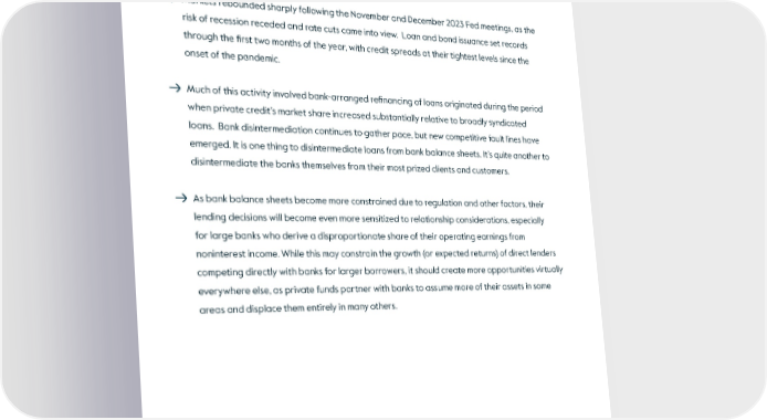EXECUTIVE SUMMARY Markets rebounded sharply following the November and December 2023 Fed meetings, as the risk of recession receded and rate cuts came into view. Loan and bond issuance set records through the 昀椀rst two months of the year, with credit spreads at their tightest levels since the onset of the pandemic. Much of this activity involved bank-arranged re昀椀nancing of loans originated during the period when private credit’s market share increased substantially relative to broadly syndicated loans. Bank disintermediation continues to gather pace, but new competitive fault lines have emerged. It is one thing to disintermediate loans from bank balance sheets. It’s quite another to disintermediate the banks themselves from their most prized clients and customers. As bank balance sheets become more constrained due to regulation and other factors, their lending decisions will become even more sensitized to relationship considerations, especially for large banks who derive a disproportionate share of their operating earnings from noninterest income. While this may constrain the growth (or expected returns) of direct lenders competing directly with banks for larger borrowers, it should create more opportunities virtually everywhere else, as private funds partner with banks to assume more of their assets in some areas and displace them entirely in many others. 2