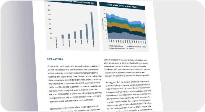 Figure 12. Change in Bank Balance Sheets Over Time SIZE MATTERS be most sensitized to broader strategic calculation. And when looking solely at the largest bank holding companies, For private credit funds, with focused business models that dependence on noninterest income appears bimodally do not take deposits or derive ancillary fees to the same distributed, with noninterest income accounting for between extent as banks, recent developments represent both a 35% and 50% of operating income for a quarter and warning and opportunity. Direct lenders whose scale pushes between 75% and 90% for another 昀椀fth (Figure 13, page 12). them to compete directly for banks’ most prized clients may 昀椀nd themselves in a position akin to U.S. steelmakers in the This suggests that the clients of a relatively small subset 1960s and 70s: forced to sell their product at market prices of especially large banks may be able to access credit on (spreads, in this case) that seem to make no sense. But more favorable terms because of the fees they generate outside of this corner of the market, circumstances are likely from potential IPOs, advisory work, acquisitions, and other to improve materially, as banks disgorge assets and more related needs, including deposit and transaction services. borrowers seek out alternative sources of credit. It’s impossible to know, analytically, which borrowers 昀椀t precisely into this bucket. One suspects that companies Size matters, both in terms of the banks against which above an annual EBITDA threshold between $200 million private lenders compete and the borrowers themselves. to $400 million would be prime candidates for precisely While all bank holding companies experienced a dip in the sorts of value-added services for which banks derive noninterest income over the past two years, it is the largest so much of their operating income, as would companies banks that derive the greatest share of their operating a昀케liated with large 昀椀nancial sponsors with deep and income from fees and whose lending decisions are likely to multifaceted banking relationships. Figure 12. Source: Carlyle Analysis; Federal Deposit Insurance Corporation, March 2024; Federal Reserve Bank of New York, March 2024. There is no guarantee any trends will continue. 11
