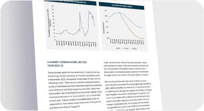 Figure 2. Simultaneous Drop in Recession Probabilities & Forward Interest Rates A MARKET LOOKING MORE LIKE 2021 large-cap tech stocks. Bitcoin has nearly doubled. Meme THAN 2022-23 coins are back in vogue. And credit markets have been red hot, with spreads at the tightest levels since the onset of The proximate spark for the recent rally in asset prices was the pandemic and bond and loan issuance at record levels the strongly hinted conclusion to the Fed’s tightening cycle through the 昀椀rst two months of the year (Figure 4, page 5). in November 2023, followed by the promise of rate cuts the following month. These announcements were premised on Re昀椀nancing has been the main driver of 2024 issuance, a rate of disin昀氀ation (at that time) that would have returned accounting for more than 64% of leveraged loans and 88% of core in昀氀ation to the Fed’s target by June 2024. Since then, high-yield bonds (M&A accounted for a trivial share of year- the monthly rate of disin昀氀ation has more than halved, which to-date issuance, though one suspects that’s likely to change would push the return of “price stability” out to the middle meaningfully in the months ahead; Figure 5, page 6). And of next year. Futures markets have dialed back rate cut a non-trivial share of that re昀椀nancing involves borrowers expectations, from nearly seven at the start of the year to opportunistically swapping out private credit in favor of just three now (Figure 3, page 5). cheaper syndicated loans. On average, private lenders charged 650 basis points over SOFR for loans extended This retracement has done little to dent investor enthusiasm. in 2022 and 2023 (Figure 6, page 6). With markets wide The stock market is up by more than 25% since the Fed open and spreads on bank-arranged 昀椀rst lien term loans signaled base rates had peaked. And, unlike prior rallies, averaging less 400bps, it’s no surprise to see borrowers take participation has been broad-based, with the 25% gain in advantage, even in cases that involve a 1% or 2% prepayment the small cap Russell 2000 nearly matching the 30% rise in fee (“call protection”).1 Figure 2. Source: Carlyle Analysis; FRBP Survey of Professional Forecasters, March 2024; ICE BAML Indices, Bloomberg, March 2024. There is no guarantee any trends will continue. 1. Pitchbook, Weekly Market Wrap, March 2024. 4