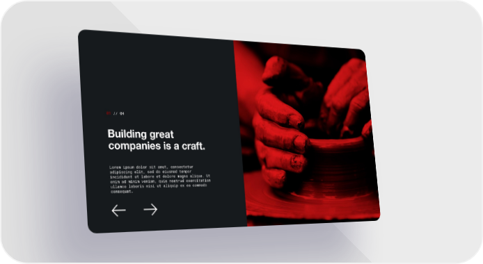 01 // 04 Building great companies is a craft. Lorem ipsum dolor sit amet, consectetur adipiscing elit, sed do eiusmod tempor incididunt ut labore et dolore magna aliqua. Ut enim ad minim veniam, quis nostrud exercitation ullamco laboris nisi ut aliquip ex ea commodo consequat.
