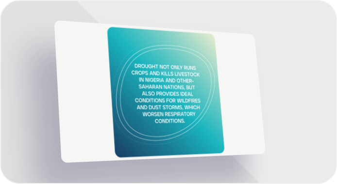 DROUGHT NOT ONLY RUNS CROPS AND KILLS LIVESTOCK IN NIGERIA AND OTHER- SAHARAN NATIONS, BUT ALSO PROVIDES IDEAL CONDITIONS FOR WILDFIRES AND DUST STORMS, WHICH WORSEN RESPIRATORY CONDITIONS.