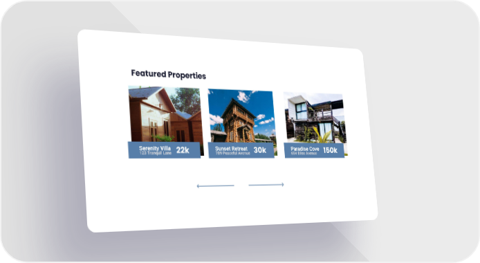 Carousel | Featured Properties Page 1 Paradise Cove 654 Bliss Avenue 150k Sunset Retreat 789 Peaceful Avenue 30k Featured Properties Serenity Villa 123 Tranquil Lane 22k