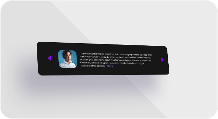 “I can't thank Stellar Claims enough for their outstanding support and expertise. When my car was involved in an accident, they handled the entire claims process efficiently and with great attention to detail. Their team went above and beyond to ensure a fair settlement, demonstrating their commitment to client satisfaction. I highly recommend their services.” - Mark S.