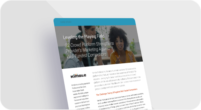 CASE STUDY THE RESULTS To date, G2 Crowd has helped Kimble PSA drive more than 100 reviews. Well-Qualified Increased Brand Competitive Leads Awareness Wins “G2 Crowd gives people choice The Results – Brand Awareness and Qualified Leads from multiple providers—it doesn’t matter how many G2 Crowd’s verified user reviews assure Kimble that “real” customers are marketing dollars a firm has commenting on its PSA solutions, as well as competitors’ products. Through G2 to spend. It’s not about telling Crowd, prospective customers gain a balanced and independent view of multiple people what to buy: it’s about PSA solutions in one place. Kimble’s results include higher brand awareness and educating buyers.” well-qualified leads. Kimble also leverages its high user-satisfaction ratings in the highly competitive Mark Robinson, PSA category to reach prospective buyers. This is a distinct advantage, as Kimble’s Chief Marketing Officer, solutions may not be highly visible on the web because some competitors have Kimble Professional Services larger marketing budgets for online advertising. Automation Thanks to G2 Crowd reviews, customers are also able to see how Kimble’s PSA solutions work with complementary “best-in- class” products from other vendors. This allows Kimble to gain an edge against larger firms with suite solutions that include a PSA component. The Action Plan – Leveraging G2 Crowd Reviews By using G2 Crowd as a key part of its marketing efforts, Kimble has leveled the playing field for its specialized PSA solution. Kimble’s customer success teams point clients and prospective customers to the G2 Crowd site for impartial and independent reviews. Reviews also establish an important feedback loop, creating a better experience for users. In addition, Kimble sees a trend toward moving away from product suites to individual products. Capitalizing on this idea, Kimble ensures that its products can be integrated with other software to customize user experience. Thanks to G2 Crowd, the best vendors of each software category rise to the top, accelerating the industry shift to best of breed. www.g2crowd.com | 847.748.7559 | [email protected]