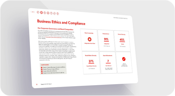 RESPONSIBLE BUSINESS PRACTICES Business Ethics and Compliance Our Corporate Governance and Board Composition Our NCG Committee develops and recommends to the full Board appropriate Board Leadership Independence Gender Diversity policies and guidelines that address key governance practices and identify the framework for the operations of the Board and its committees, as well as monitor developments in law and governance practices. For more information, please see our Corporate Governance Guidelines on the Investor Relations page 91% 45% of our website. We believe that the effectiveness of our governance framework is largely a Independent Board Chair Independent Female function of the highly qualified, experienced and diverse Board and leadership team who are focused on driving Casey’s long-term success. The Board is (10 of 11 directors) (5 of 11 directors) comprised of qualified individuals who provide the mix of director characteristics and diverse experiences, perspectives and skills appropriate for creating sustainable value for our shareholders and other stakeholders. In June 2022, we welcomed yet another highly skilled director to the Board, broadening its overall technology expertise. We are proud to have 11 highly qualified and experienced directors on our Board, collectively bringing a broad range of executive leadership, consumer retail, restaurant and food service, marketing, Racial/Ethnic Diversity Board Refreshment operations, supply chain, mergers and acquisitions (M&As), technology, finance and accounting expertise, as well as broad gender, race, ethnicity and geographic diversity. 27% 7 LEARN MORE All Board Racial/Ethnic Diversity New Directors committees are Casey’s Code of Business Conduct and Ethics led by female chairs Casey’s Financial Code of Ethics (3 of 11 directors) New, Highly Qualified Casey’s EthicsPoint Hotline Directors since 2018 Casey’s Corporate Governance Guidelines 15 Casey’s 2022 ESG Report