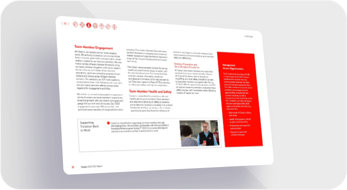 OUR TEAM Team Member Engagement company. The results reflected favorable team alcohol or any illegal or controlled substance that At Casey’s, our people are our most valuable member feedback on empowerment, trust and could prevent one from conducting work activities asset. We actively promote an environment that mutual respect and opportunities to improve in safely and effectively. fosters honest, good-faith communication about areas of learning and development and overall Management matters related to our business activities. We also well-being. Robbery Prevention and host a variety of team member forums to bring Store Burglary Procedures Access Opportunities our team members together with senior leaders The human resources team reviews the survey All Casey’s store team members are required to to learn the current status of our business results and uses them to design an action plan complete training on how to identify instances The Frontline Advisory Board (FAB) operations, build our collective purpose-driven for each functional area. The survey feedback of crime at the stores, such as burglary or is a grassroots team within Casey’s culture and discuss areas of team member provides valuable information about our shoplifting, and what safety precautions to take established to provide two-way concern. For example, our SLT hosts quarterly workplace environment, which may be used by to keep team members and guests safe. During communication between the field companywide town halls following earnings calls, our Extended Leadership Team (ELT) to develop FY 2022, 91% of required team members and 97% and our Extended Leadership Team. and our newly launched affinity groups meet or refine our culture and business objectives. of required leadership members completed these The FAB is relied on to provide direct regularly for engagement activities. safety courses, with incomplete results reflecting feedback around improvement Team Member Health and Safety impacts of regular turnover. opportunities, and planned and We deliver an annual companywide engagement Casey’s is committed to providing a safe and current initiatives, as well as survey to assess our team members’ experience, healthy working environment. Team members transparency from leadership at the ensure alignment with our mission and goals and are required to abide by all safety procedures SSC. Members are Store Managers gauge the current level of morale. Our 2022 and to take the necessary precautions to protect who are nominated within their engagement score was 76% across full- and themselves and their co-workers. This includes regions and exhibit the following part-time team members throughout the entire reporting to work free from the influence of characteristics: • Role model of Casey’s culture and values Supporting • Leader among peers, viewed Casey’s is committed to supporting our team members through as open and trustworthy Transition Back challenging times. We launched a partnership with ReEmployAbility’s • Professional and respectful to Work Transition2Work program during FY 2022 to accommodate injured communicator and sick team members in their transition back to work. • Potential to grow into a District Manager 31 Casey’s 2022 ESG Report