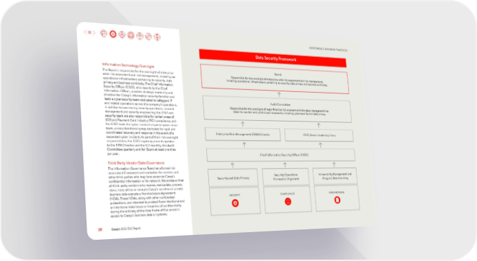 RESPONSIBLE BUSINESS PRACTICES Data Security Framework Information Technology Oversight Board The Board is responsible for the oversight of enterprise Responsible for the oversight of enterprise wide risk assessment and risk management, wide risk assessment and risk management, including our including operational infrastructure pertaining to security, data privacy and business continuity. operational infrastructure pertaining to security, data privacy and business continuity. The Chief Information Security Officer (CISO), who reports to the Chief Information Officer, provides strategic leadership and direction for Casey’s information security function and leads a cybersecurity team dedicated to safeguard IT Audit Committee and related operations across the company’s operations. Responsible for the oversight of major financial risk exposure and the steps management has In addition to overseeing security operations, incident taken to monitor and control such exposures, including cybersecurity and data privacy. management and security engineering, the CISO and security team are also responsible for certain areas of SOX and Payment Card Industry (PCI) compliance, and the CISO leads the cyber incident response governance team, a cross-functional group dedicated to rapid and coordinated recovery and response in the event of a Enterprise Risk Management (ERM) Director CEO, Senior Leadership Team suspected cyber incident. As part of their risk oversight responsibilities, the CISO regularly presents updates to the ERM Director and the SLT monthly, the Audit Committee quarterly and full Board at least one time per year. Chief Information Security Officer (CISO) Third-Party Vendor Data Governance The Information Governance Team has a formal risk assessment framework and evaluation for vendors and other third parties who may have access to Casey’s Security and Data Privacy Security Operations Vulnerability Management and confidential information or its network. We endeavor that Framework Alignment Program Benchmarking all third-party vendors who receive, manipulate, process, store, host, utilize or compile Casey’s sensitive or private business data execute a Nondisclosure Agreement (NDA). These NDAs, along with other contractual SECURITY COMPLIANCE PREPAREDNESS protections, are intended to protect from intentional and unintentional data losses or breaches of confidentiality during the entirety of the time frame of the vendor’s access to Casey’s business data or systems. 20 Casey’s 2022 ESG Report