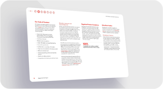RESPONSIBLE BUSINESS PRACTICES Our Code of Conduct Education, Awareness and Regulated Product Compliance EthicsPoint Hotline All directors and team members are expected Acknowledgments We require our store team members to meet We take pride in caring for our guests, our to abide by our Code of Business Conduct and All full- and part-time team members are required certification requirements aligned with state communities and each other. To that end, Casey’s Ethics (Code), which helps drive our culture to complete compliance training on our Code regulations for regulated products like tobacco maintains a confidential, third-party EthicsPoint of honest and ethical conduct, compliance through our online learning platform upon joining and alcohol, including responsible server training Hotline for reporting any concerns that possibly and accountability, notably covering the Casey’s and annually thereafter. Compliance specifically for these age-restricted products. violate law, regulations, policies or standards. following areas: training and reporting channels are routinely During FY 2022, nearly 100% of our store team reviewed to reflect prescient risks and topical members who were eligible to sell these products Whistleblower Protection • Casey’s Anti-Harassment and Anti- concerns. During FY 2022, approximately 88% completed this required training. We also regularly Casey’s adheres to all applicable laws protecting Discrimination Policy and the Equal of our team members completed this required engage independent third parties to test and our team members from retaliation. Retaliation Employment Opportunity (EEO) Act compliance training covering the topics within our assess our store compliance regarding age- in any form against anyone who reports, in good • Conflicts of interest Code, with the remaining 12% incomplete largely restricted products. faith, a suspected or known violation of the Code due to turnover. or of law or who assists in the investigation of • Related-party transactions a reported violation is strictly prohibited. Any • Insider information and securities trading Our CEO and certain financial team members act of retaliation in this regard — such as • Corporate opportunities are also trained on and expected to adhere to our 100% termination, demotion, disciplinary action or Code of Ethics for the CEO and Senior Financial of applicable team members completed reducing hours — is required to be reported • Confidential or proprietary information Officers Financial Code of Ethics, which they required Financial Code of Ethics training. immediately, and appropriate discipline, up to • Proper use and protection of company assets acknowledge annually. For more information, and including termination, will be provided. please see our Financial Code of Ethics on the • Gifts and entertainment Investor Relations page of our website. As of • Internal accounting controls and business FY 2022, 100% of applicable team members records completed this required training. • Health and safety protocols We have a formal Security Awareness Training • Competition, fair dealing and antitrust issues program for all team members that addresses employee data management and responsibilities. Training is provided at orientation for newly hired team members and annually thereafter. For more information, please see the Data Security and Customer Privacy section of this report. 16 Casey’s 2022 ESG Report
