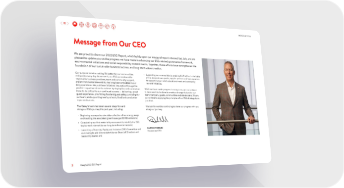INTRODUCTION Message from Our CEO We are proud to share our 2022 ESG Report, which builds upon our inaugural report released last July, and are pleased to update you on the progress we have made in advancing our ESG-related governance framework, environmental initiatives and social responsibility commitments. Together, these efforts have strengthened the foundation of our sustainable business success and long-term value creation. Our purpose remains making life better for our communities • Supporting our communities by enabling $4.7 million in charitable and guests every day. As we see it, our ESG commitment to giving alongside our guests, supplier partners and team members responsible business practices, team and community support, to support hunger relief, educational needs and community and environmental stewardship has long been embedded in our servant initiatives. daily operations. We put these initiatives into action through the positive impact we strive to achieve by staying focused on what we While we have made progress in many areas, we realize there know to be critical to our continued success — delivering a great is more work to be done to create a stronger future for our guest experience; prioritizing food and guest safety; providing for team members, guests, communities and stakeholders. We are our team; and supporting nearby schools, food banks and other committed to applying the principles of our ESG strategy to do important causes. just that. The Casey’s team has taken several steps forward We look forward to continuing to share our progress with you along our ESG journey this past year, including: along our journey. • Beginning a comprehensive data collection of our energy usage and tracking the associated greenhouse gas (GHG) emissions; • Completing our first materiality assessment to identify the ESG topics most relevant to our long-term financial success; • Launching a Diversity, Equity and Inclusion (DEI) Committee and DARREN REBELEZ continuing to add diverse talent to our Board of Directors and President and CEO leadership teams; and 3 Casey’s 2022 ESG Report