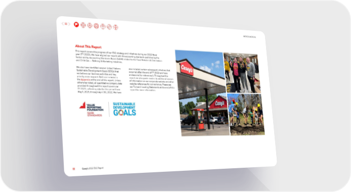 INTRODUCTION About This Report This report covers the progress of our ESG strategy and initiatives during our 2022 fiscal year (FY 2022). We have aligned our report with the accounting standards published by the Sustainability Accounting Standards Board (SASB) related to the Food Retailers & Distributors and Oil & Gas — Refining & Marketing industries. We also have identified several United Nations also included certain subsequent initiatives that Sustainable Development Goals (SDGs) that occurred after the end of FY 2022 and have we believe our business activities and key endeavored to note as such. Throughout the priority areas support. Both are included in report, we also guide readers to additional sources the Appendix at the end of this report. Unless of information on our corporate website and other otherwise noted, all quantitative company data website references for convenience. Please see provided throughout this report covers our our Forward-Looking Statements at the end of this FY 2022, reflecting data for the period from report for more information. May 1, 2021, through April 30, 2022. We have 13 Casey’s 2022 ESG Report