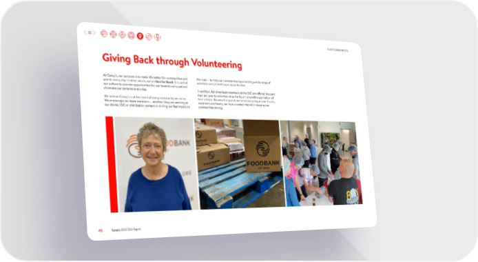 OUR COMMUNITIES Giving Back through Volunteering At Casey’s, our purpose is to make life better for communities and the road — to help our communities by providing a wide range of guests every day. In other words, we’re Here for Good. It is part of volunteer and philanthropic opportunities. our culture to provide opportunities for our team to carry out and showcase our purpose every day. In addition, full-time team members at the SSC are offered two paid days per year to volunteer at a charity or nonprofit organization of We believe Casey’s is at the heart of every community we serve. their choice. Because the guests we serve every day are our friends, We encourage our team members — whether they are working at neighbors and family, we have a vested interest in keeping our our stores, SSC or distribution centers or driving our fuel trucks on communities strong. 45 Casey’s 2022 ESG Report